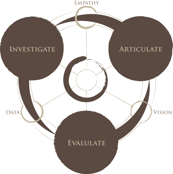 We begin with brass tacks. We need to know what the problem is, what the goals are, whose goals we're supporting and why. For this, we investigate.